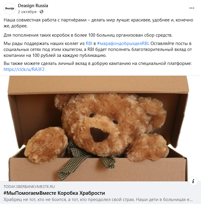 Группа RBI стала участником благотворительной акции «Коробка храбрости», запущенной 01 июня этого года ко Дню защиты детей благотворительным фондом «Шередарь» и ПАО Сбербанк.