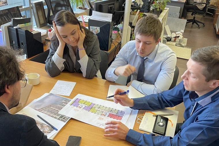 А на этом фото, например, недавнее совещание с коллегами из дирекции по строительству по новому проекту на Большевиков – погружались в тему с кондиционированием. Попросили коллег посмотреть, правильно ли проектировщик заложил ниши под кондиционеры на фасаде. И оказалось, что он не учел размеры внешних блоков – есть место только для шести, а квартир на этаже восемь. Если бы мы сейчас не «отловили» этот момент, люди бы через 4 года заселились в дом – и последние двое не смогли бы разместить свои кондиционеры. И таких моментов очень много в нашей работе – технических, дизайнерских и прочих тонкостей.