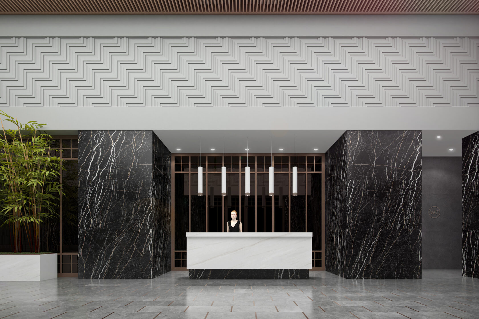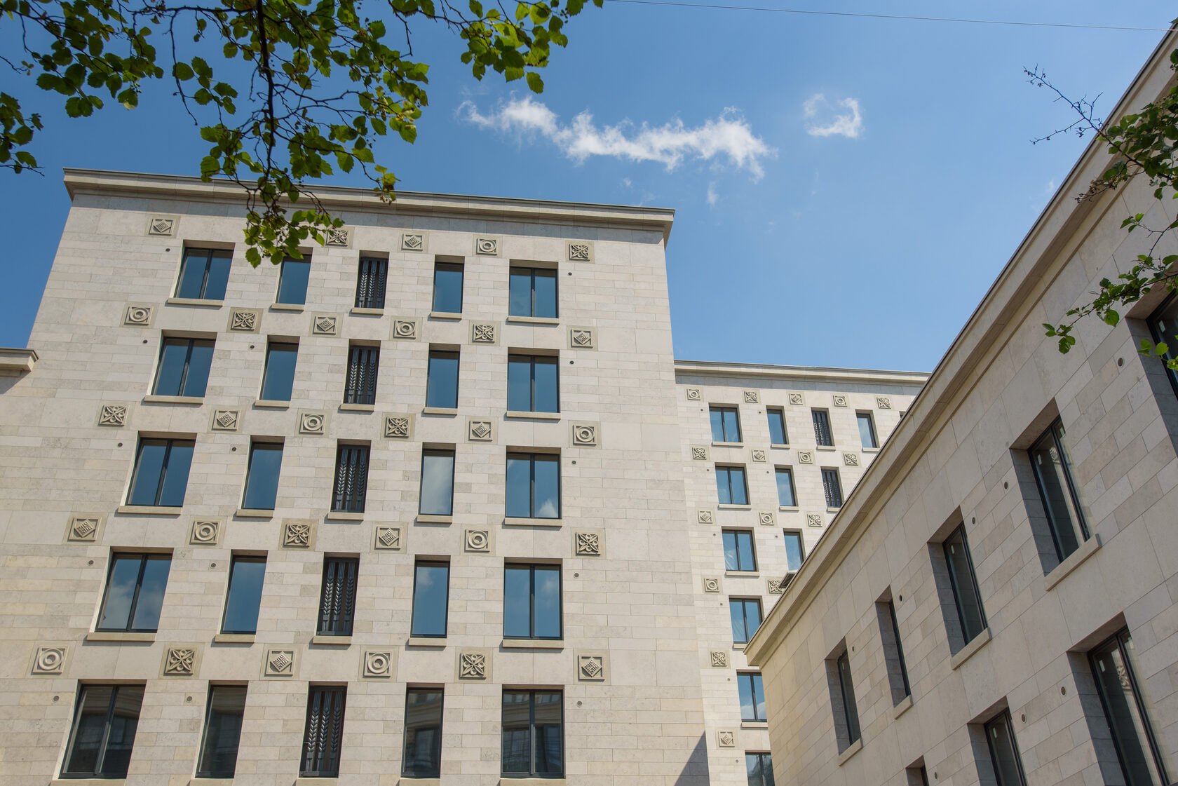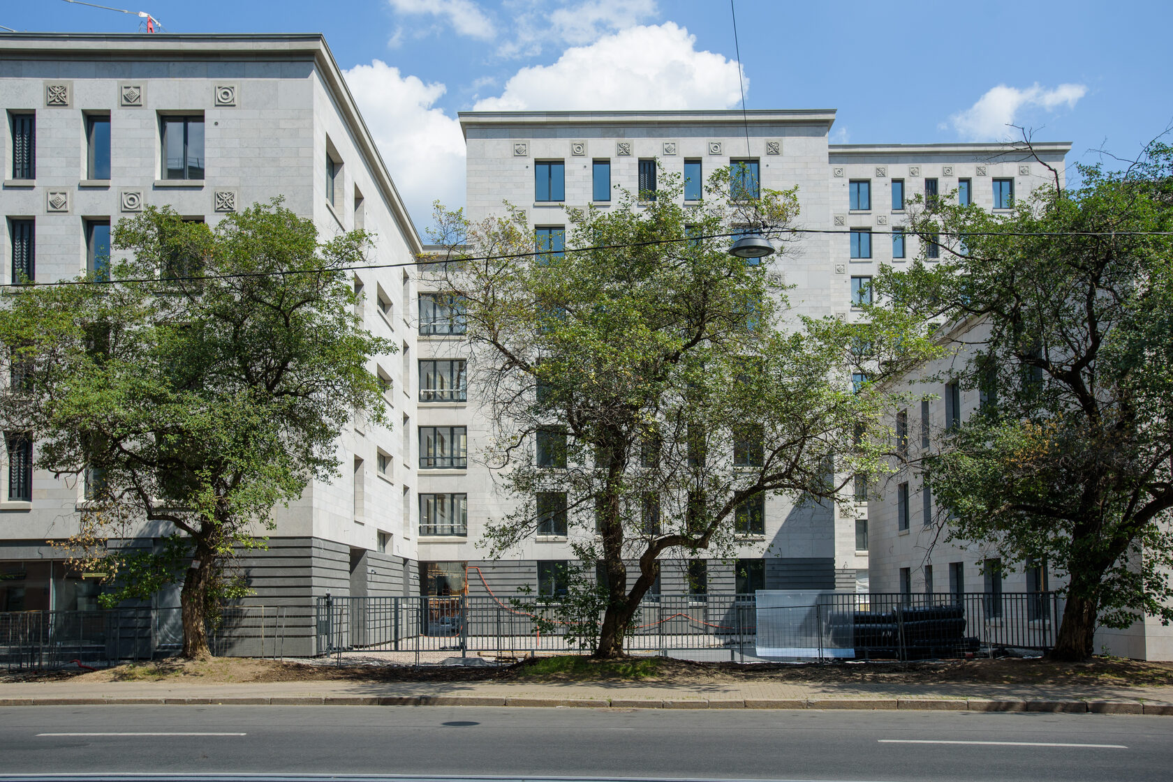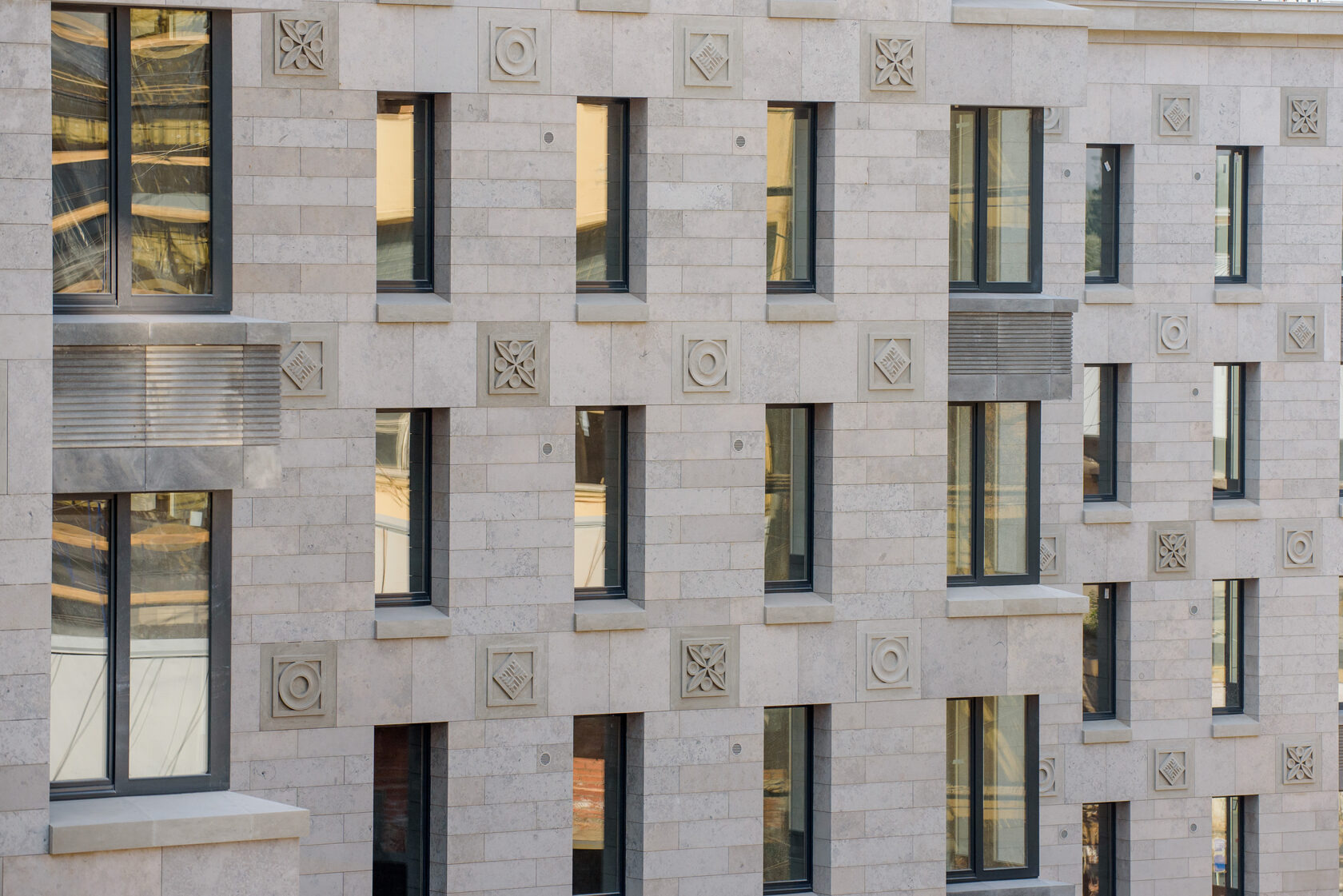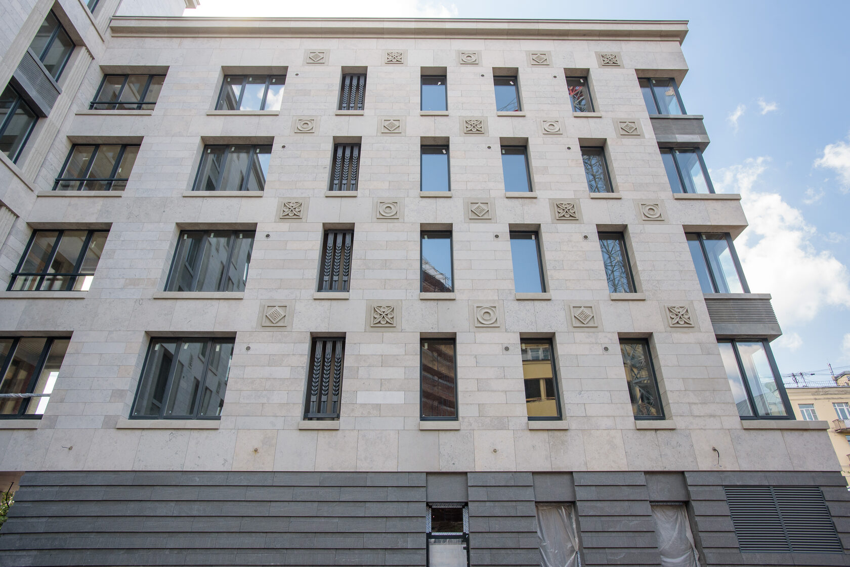 Мы, конечно, спросили у Александра: ведь не одними же своими «проблемами» и сложными кейсами запомнится этот проект? В чём ещё наш Futurist впереди планеты всей? И он первым делом повёл нас смотреть фасад. Вот это настоящая «изюминка»! Облицовка из необычного натурального камня… Два нижних этажа сейчас отделываются гранитом «габбро», который поставляется с карьеров из Карелии. А те этажи, что выше, – импортным известняком, известным как «юрский мрамор».
